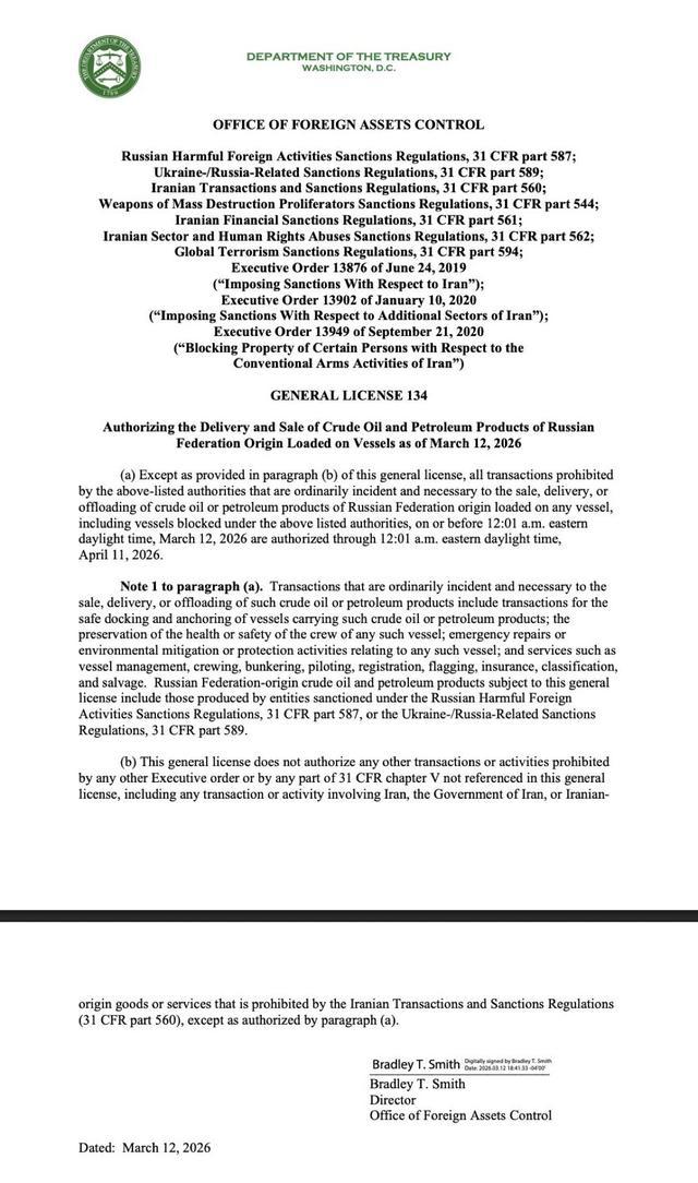 当地时期3月12日,好意思国财政部发布的一份文献裸露,好意思国发布为期30天的豁免令,允许列国购买现在淹留在海上的俄罗斯石油,旨在褂讪因伊朗接触和霍尔木兹海峡航运问题而受到干涉的大家动力市集。笔据该豁免令,俄罗斯石油销售许可证从3月12日起,灵验期至4月12日,但不适用于与伊朗筹议的往复。