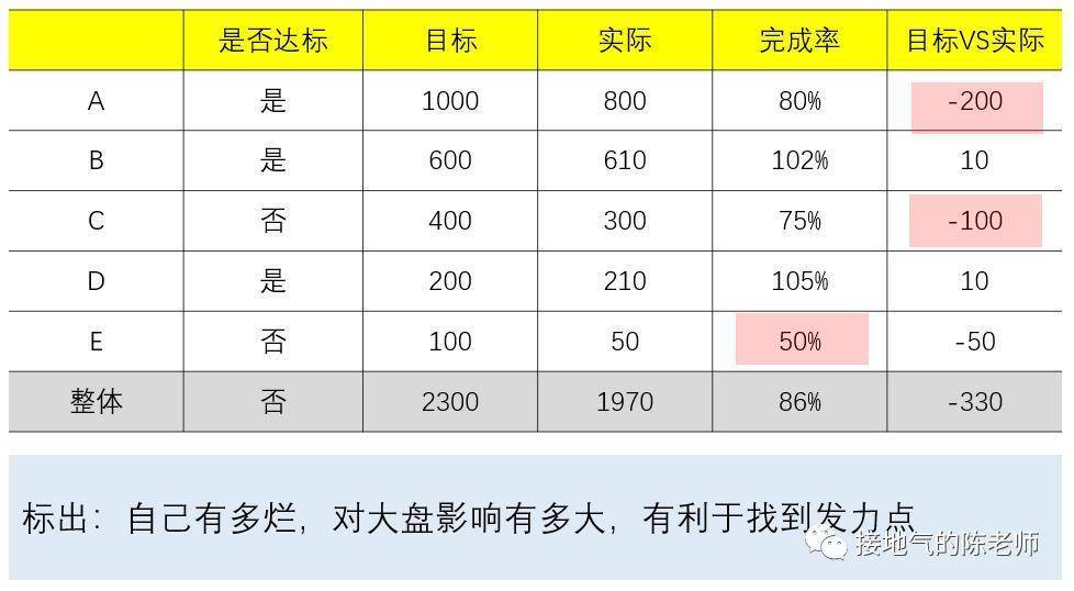 比如分析功绩为啥没达标?产物、用户、分公司等维度,齐拉出来作对比,看哪个维度互异大(如下图)
